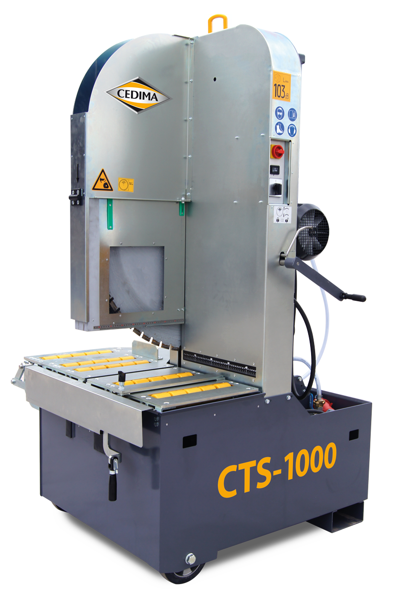 Die CEDIMA Turmsäge CTS-1000 ist eine kraftvolle Maschine zum vertikalen Trennen großformatiger Bausteine mit Diamant-Trennscheiben bis Ø 1000 mm. Motor und Getriebe sind so ausgelegt, dass die Umfangsgeschwindigkeit des Diamantwerkzeuges immer sehr nahe dem optimalen Wert von 50 m/s liegt. Unter diesen Bedingungen werden hervorragende Schneidleistungen und hohe Standzeiten erzielt. Die einfache Handhabung, Übersichtlichkeit und ein hoher Sicherheitsstandard ermöglichen ermüdungsfreies, bedienerfreundliches Arbeiten.