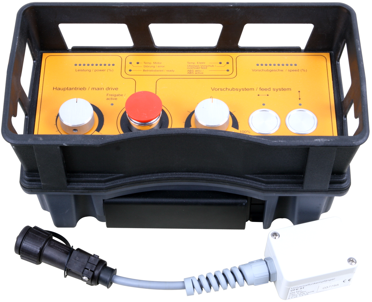 Die optional erhältliche Funkfernbedienung für CEDIMA-Wandsägen mit elektrischen Vorschubantrieben. Alle Steuerungsfunktionen werden kabellos zur Steuerung der Wandsäge übertragen.